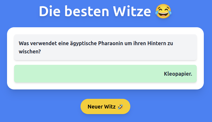 Die Witze sind jetzt nicht schlecht, aber es könnten mehr sein, weil bei mir immer die gleichen kommen. Außerdem finde ich die UI cool. Die Witze waren teilweise gut :) Insgesamt tolles "Spiel"